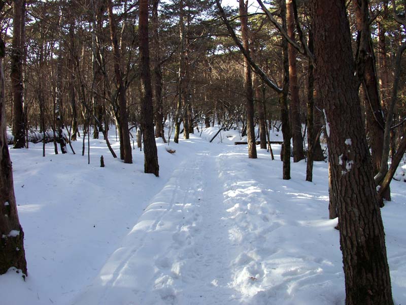 赤松林の中の遊歩道は殆ど整備されていない、所々大きくくぼんだ、松の根っこがむき出しの緩やかな登り道を登っていく、五分ほど進むとやがて視界が開けてくる。