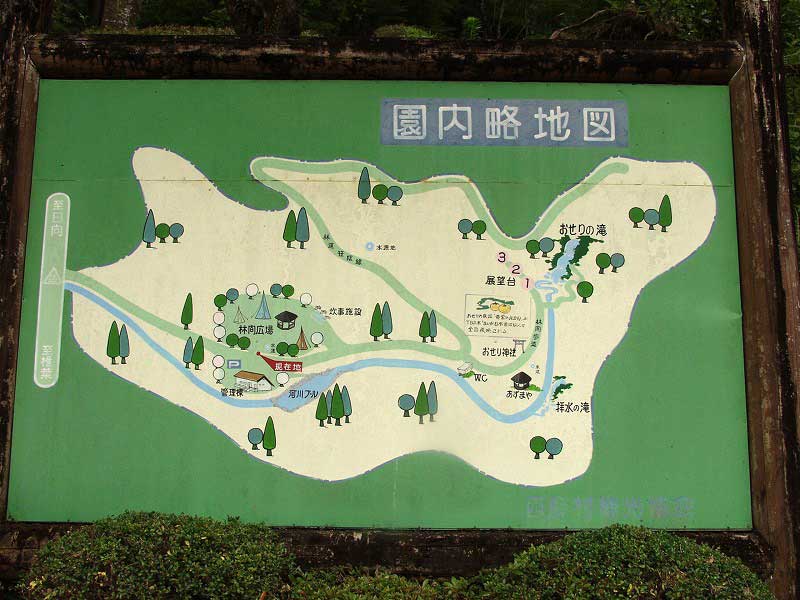 おせりの滝(大斗の滝)おせりの滝周辺にはカシ類を主とする常緑広葉樹林が多く、おせりの滝と一体となり見事な景観を形成しています。また周辺約1kmには自然遊歩道やキャンプ場、自然河川プールが整備されており、こども達や家族連れでにぎわいます。遊歩道には滝を見るための展望台が5ヶ所設けられており、それぞれ違った景観を楽しむことができます。 ここは、このようにすぐれた自然環境を後世に引き継ぎくために、緑地環境保全地域として宮崎県に指定されています。 アクセス 日向市より国道327号線を西へ、椎葉村方面に進んでください。日向市から30分程度です。 駐車場から渓流沿いの遊歩道を歩いて行きます。展望所は全部で5ヶ所あります。右下の写真は案内板の現在地から撮影したものです。ここからでは2段目の滝はあまりよく見えません。 現在地付近から橋を渡り、遊歩道を登っていきます。途中傾斜がきつく、遊歩道が崩土により塞がっている所もあります。足腰に自信の無い方は控えた方が良いでしょう。真ん中の写真の右隅に写っているのが展望所です。ここからだと1段目、2段目の滝が良く見えます。 案内板にはこの先に展望所が表示されて無いですが、遊歩道がまだ上に続いているようなので、さらに登っていくことに・・・ 左端の写真は1段目の滝をやや上から撮影しました。真ん中の写真は1段目の滝の滝壺です。 上へ進んでいくと展望所がありました。が、木がうっそうとしていて滝が良く見えません。 まだ遊歩道が続いているのでさらに登っていきます。 下の写真(真ん中、右)は登りきったところです。 右の写真の中心辺りが滝の落ち口だと思います。。 遊歩道はまだ続いているのですが、高低差70mを登り足がふるえてきたので引き返すことに・・ 写真左側は滝の方から見た展望所です。(下が第1、上が第2) 写真右側は第2展望所からの眺めです。 下からの眺めだと3段しか見えなかったのですが、1段目の滝の上にもう一つ小ぶりの滝があります。 そこからさらに登ると第3展望所です。 おせりの滝キャンプ場、河川プールキャンプ場は7月と8月の間のみ利用できます。河川プールにはまだ水が溜められていませんでした。。 問い合わせ先:西郷村企画課 TEL:0982-66-3111 FAX:0982-66-3137 周辺の観光地:石峠レイクランド 牧水公園 若山牧水生家 周辺の温泉:温泉県北で探す 周辺の宿泊施設:日向市で探す 戻 る TOPへ |