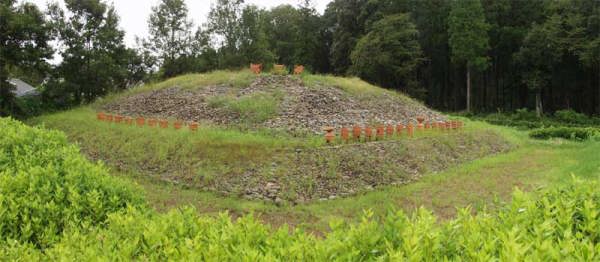 171号墳墳丘の表面は川原石(葺石)で覆われています。 鬼の窟(いわや)古墳直径37m高さ7.3mの2段墳丘の古墳で墳丘の周囲に二重の提(土塁)を持っています。土塁は高さ2m〜2.5m幅は基底部9m外側直径は南北71.9m東西73mです。 西都原古墳群では横穴式石室を持つ唯一の古墳 江戸時代後半頃に開口され、その経緯についての資料が残っていないが古くから参道の両側に老松が植えられているなど鬼の岩谷信仰を物語っています。 平成7年度の調査で、石室から組合せ式木棺と推定される鉄釘・耳環・金銅装馬具・須恵器のかけらが出土しました。 その陪塚とみられる205号円墳(径14m・高さ3m)から土器や平成7年の調査で周溝から須恵器(坏、高坏)・土師器(ほじき)等が出土しています。