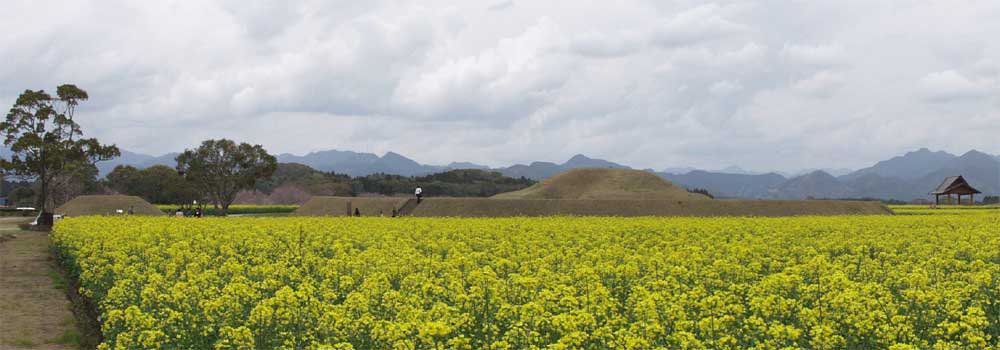 西都原の前方後円墳と円墳他悠久の時を経て静かに古墳は語る。 古代日向の中心西都原の古墳について、今までに発掘された三十数基の古墳と出土品、その出土品から判った事柄について、西都市考古学研究所日高先生の著書「西都原古墳文化を探る」等に基づき紹介検証していきたいと思います。 東西2Km、南北4Km、標高70mの丘陵(西都原)に311基もの古墳が集まっていること、全国的に非常に希なことだそうです。その種類は西都原のTOPページにも記載しましたが以下の通りです。 ・前方後円墳・・・ 31基(内10基が柄鏡式前方後円墳) ・方 墳 ・・・ 1基 ・円 墳 ・・・279基 前方後円墳は首長墓の基本形として全国で作られていますが、西都原古墳群にある前方後円墳は前期様式の柄鏡式前方後円墳が10基存在していることも大きな特徴です。 柄鏡式前方後円墳は、前方後円墳の形が定まる以前の古墳時代前期に作られたものと想定されています。 13号墳へ 81号墳へ 169号墳へ 170号墳へ 男狭穂塚・女狭穂塚両古墳は、天皇家祖先のお墓の可能性があるため、宮内庁陵墓参考地に指定され正式な発掘調査は実施されていません、また内部に入ることもできません(年に1度だけ11月第1日曜日に公開されます)。 御陵墓参考地内は樹木が生い茂り古墳の形状すら見分けられないほどです。形状を保つ状態での調査や外形を確認できる程度には整備してほしいところです。(宮内庁のより一層の解放が望まれます) 両古墳は前記の通り御陵墓参考地であるため全く発掘調査できないためその陪塚とされる169・170・171号墳を調査することにより解明が進められています。 写真:男狭穂塚入り口に建つ御陵墓参考地の看板 男狭穂塚男狭穂塚は5世紀初頭に建造された西都原古墳群中最大の古墳です。 2004年末から2005年当初にかけて男狭穂塚の前方部と後円部の接続部分のレーザー探査が実施され、男狭穂塚の形状は、全国で最大の帆立貝式前方後円墳であることが実証されました。 写真は男狭穂塚(右側の少し盛り上がった山)と女狭穂塚(左の山) 女狭穂塚築造年代は男狭穂塚よりやや新しい5世紀前半中葉頃。古墳の周りに幅20mの周溝を持つ形の整った前方後円墳。昭和50年に盗掘にあい、その時円形埴輪の破片などが確認されています。 5世紀初め頃畿内地方では第15代応神天皇・第16代仁徳天皇の古墳を筆頭に100mを越す巨大古墳が作られ始め、その後日本各地で畿内式古墳が造られるようになったと考えられています。 築造年代は、女差穂塚の方が男狭穂塚より古いという説もあります。 (写真は両墳を表す女狭穂塚前にある模型:左が女狭穂塚右男狭穂塚) 169号墳・170号墳13号墳へ 81号墳へ 169号墳へ 170号墳へ男狭穂塚の陪塚と考えられている円墳、子持家形古墳や舟形古墳など貴重な出土品がある 169号墳 第2次第3次調査により子持ち家形埴輪・舟形埴輪は、170号墳から出土したことが判明しました。築造年代は女狭穂塚とほぼ同一年代と考えられています。 170号墳(雑掌塚) 13号墳へ 81号墳へ 169号墳へ 170号墳へ 170号墳は男狭穂塚の陪塚です。169・170号墳は西都原最大の円墳で、大正元年に発掘調査され平成15年再発掘調査後整備され綺麗な円墳の形に復元されました。 第2・3次調査概要は170号墳説明会資料1パージをご覧下さい。 右の写真は大正時代の第1次調査時御掘削痕(中央の深い部分)と第2・3次調査時の掘削状況。 調査トレンチの正確な位置図は説明会資料の2ページをご覧下さい。 今回の調査結果から子持ち家形埴輪、舟形埴輪の破片多数が170号墳墳頂東部から発掘され、今まで169号墳から出土したと言われていた定説は覆され170号墳から出土したことが判りました。(今後東京国立博物館において確認作業を行う事により確定します) 墳丘外周に幅8mの周溝も発見され、形状は現状よりかなり大きな円墳です。 子持ち家形埴輪と舟形埴輪(複製)の写真は説明会資料3ページをご覧下さい。 また第1次調査時の写真は説明会資料の4ページをご覧下さい。 以上のことから当HPの記載も上記の通り訂正します。