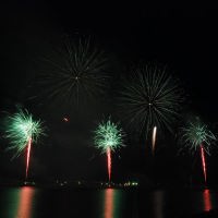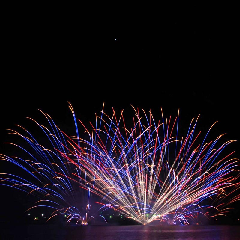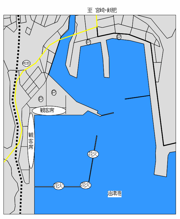 油津港まつり 花火大会「油津港まつり 花火大会」の特徴は、斜めに発射した花火が水面で炸裂して扇状に開く水中花火、宮崎県内ではここだけとあって毎年約三万人以上の人出で賑わいます。 また2008年は第4部に2尺玉(20号)打ち上げ花火や銀色の水中花火などが新たに加わり、花火の数も7000発とより豪華な花火大会となりました。 ステージでのイベントも、エイサーや太鼓に続き隣町の串間市から来た「ほう」?さんの透きとおった声とレゲのリズムが南国日南のイメージとマッチし特に印象に残りました。出来れば、また聞きたいです。 会場の油津漁港は、岸壁に出店約100軒が軒を連ね昼間はビヤガーデンなどの催しが開かれます。 夕方6時頃から続々と浴衣姿の若者を中心に家族全員がグループとなって集まり、7時からエイサーや太鼓演奏・レゲ演奏とステージでのイベント、8時には日がとっぷりと暮れ、花火の始まる頃には広い岸壁が人出で埋まってしまいます。 花火は南突堤?の先端・中央・西側の3箇所から主に割れ物の菊や牡丹・椰子・冠菊に時折ポカものが打ち上げられ、西側からは斜め打ち上げ花火と水中花火が打ち上げられます。 珍しいのはなんと言っても水中花火、斜めに発射された花火が海面をバウンドしながら着水し、水中で炸裂、扇状に開く様子は見物です。 また垂直打ち上げ花火も海面で反射し、一瞬海面が明るく輝きます。 最後は水中花火と打ち上げの菊・冠菊等の花火を3箇所+2箇所からのスターマイン、観客席はオォーとどよめきと拍手喝采に包まれます。そしてフィナーレは20号の打ち上げ花火が空高く打ち上げられ空いっぱいに広がりました。 2008年の花火 個々の花火も8号10号20号と大きくなり色や種類はより繊細で華やかに、そして打ち上げプログラムが工夫されとても見応えのある花火大会でした。最後が20号打ち上げ花火 2005年の花火