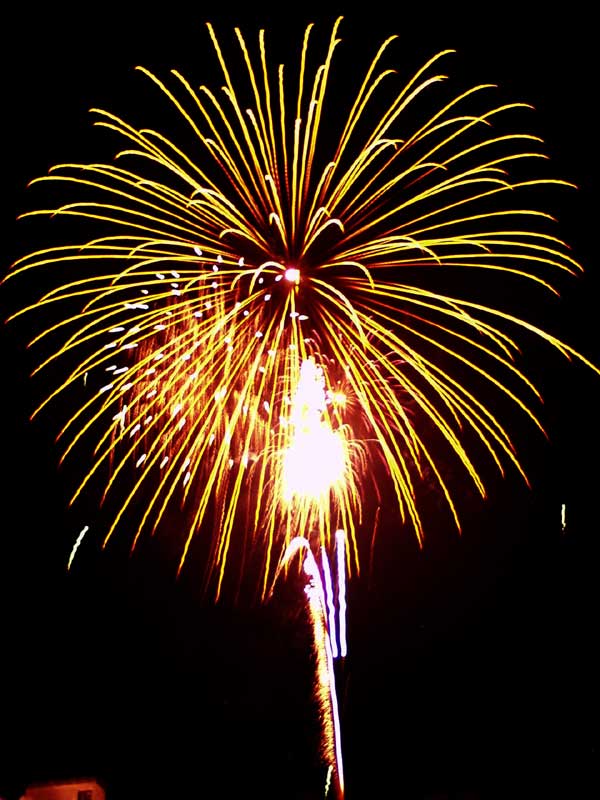 えびの市にこんなに人がいるのかと言うほど3万人の観客、地元出身の若者は男も女も昔ながらの浴衣やじんべえ姿、女性の浴衣姿が多いのが印象的です。 京町温泉夏祭り花火大会は、地元の氏神様荒神堂(こうじんどう)夏祭りから発展復活したものだ、以前は山車も出ていたが徐々に廃れてしまい、灯籠を飾り子供御輿を出すなど「未来塾京町」のボランティア活動により復活した。 復活したのは祭りだけではない、浴衣を着て夏祭りを祝う習慣が現在の若人に確実に受け継がれています。 祭りは荒新堂での神事子供御輿の後、場所を花火大会会場に移しステージでは高崎町出身フォーク歌手浜川奈津子さん作詞作曲のフォークソングが花火開始の21時まで演奏されました。 21時から花火大会、菊・牡丹のなど割れ物にポカ物が混ざる。最後はスターマインの連発で大団円を迎え観客のどよめきと拍手でフィナーレを迎えました。 花火の様子