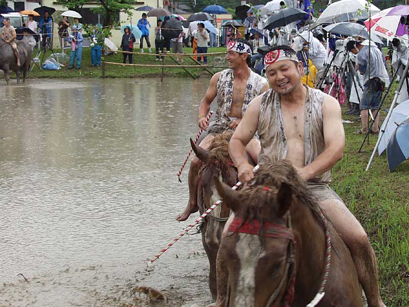 御田祭(おんださい)![]() 御田祭は970年の伝統を持つ美郷町西郷区(旧西郷村)田代神社の田植え祭りです。 祭りは古来から、世襲制の家柄が中心に祭事役(ミヨド・ウナリ・ノボリモチ)を務め、これに一般の参詣者が加わり、神人・牛馬一体となって整地・田植えを行う神事です。 まつりのハイライトは、牛・馬・御輿を神田に入れての整地神事。村の若者が泥しぶきをあげて牛馬を駆け回し、更に青年御輿が勇壮に神田入り、牛馬も人も泥のかけ合い、文字通り泥まみれになって整地します。牛馬の疾走する際の泥しぶきは畦道で見学する参詣者にふりかかり、足先から頭まで泥しぶきの洗礼を受けます。 ![]() 整地の後、田植えの神事がおこなわれ、催馬楽(さいばら)の歌われる中、揃いのかすりに笠をかぶった早乙女たちによる、「お田植え」が華やかに行われます 。「お田植え」に参加する早乙女は村内中学生・婦人会及び村外から予め選ばれています。申し込みなどは美郷町西郷区のHPからどうぞ 参詣者の無病息災と豊作を祈願し、同時に、牛馬の守護神かつ農耕の神として、牛馬安全を祈願するものです。 この神田の泥しぶきを浴びると無病息災が約束されると言われています。 この祭りには、催馬楽(さいばら)の歌詞も伝えられ、古来の田楽神事がしのばれ、日本国内でも非常に珍しい民俗行事です。昭和63年3月8日無形民俗文化財として県の指定を受けています。 御田祭の由来 田代神社は、標高897.7メートルの日陰山、またの名を権現山の中腹に祀られ、長元五年壬申の年(1032年)に創建され、旧社名を霧島神社という。 祭りの日は、田代神社の本社が権現山の中腹にあるため、上円野神社までの神霊の御降りを願って、安置された御輿に乗り移られ、途中上の宮田に神幸、田植え終了後中の宮田に祀ってある年の神に神幸される。(御田祭パンフより引用) 行事(2006年) 7月2日 ふるさとうまいもん広場 納涼花火大会 20:15〜21:00(3000発) 7月3日 御田祭 上円野神社神事 8:00 御神幸行列出発 8:50 上の宮田着 9:20 豊年祈願太鼓 9:40 祭典 10:30 子供みこし入れ 10:30 牛馬入れ (9:00〜随時) 豊年神楽奉納 10:50 婦人舞踊 11:30 田植え神事 11:50 田植え 12:00 四半的大会 9:00〜 日向田植え唄全国大会(決勝) 13:00〜 歌謡祭 14:30〜 花火大会 花火が高地(葉桜ふれあい公園)で打ち上げられ、連発の花火が前に打ち上げた花火の煙に隠れることがなく、御田祭の里ふれあい広場や農道・畦道から見るロケーションは何とものどかで最高です。 前夜祭時には、役場から御田祭の里ふれあい広場までの道路沿いに100軒ほどの出店が並び、町内はじめ隣接する市町から家族連れや浴衣姿の若者が沢山集まり、とても賑わいます。 駐車場(交通整理員の誘導に従ってください) 村総合グラウンド駐車場、村農村環境改善センター駐車場、村職員駐車場、県林業総合センター駐車場、JA日向西郷支店駐車場、田代小学校グラウンド、西郷中学校グラウンド 西郷村付近案内図 お問い合わせ 西郷村企画課 御田祭奉賛会 0982-66-3609 戻 る 祭りTOPへ |