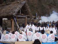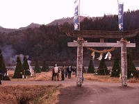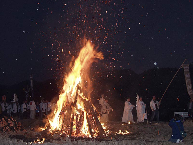 師走祭り(しわすまつり)/神門御神幸師走祭りは木城町と美郷町南郷区(旧南郷村)にまたがって1000年以上も前から脈々と引き継がれ、異国の地で亡くなった百済王一族を慰める祭りです。昔話風百済王伝説はこちらをご覧ください。 旧歴の正月の前(西暦では1月最後の週末)に、比木神社に祀られている百済の福智王の御神体が神門神社に祀られている父の帝嘉王に対面する儀式です。 木城町から神門まで18名の神職などが御神体を棒の先に担いだ(これは御輿の始まりの形とも言われています。)御神幸行列により行われ、南郷区神門で対面、歓迎の様子を表しています。 これらのことを証明する鉾や銅鏡等多数が御門神社に保存されていましたが、現在は西の正倉院に保存されています。 神門神社・西の正倉院はこちらをご覧ください。 木城町から約90kmも離れた神門までの御神幸は、昔は9泊10日をかけ全行程を歩いて行われていましたが、現在は途中車を使って2泊3日で行われています。 1日目は「上りまし」と言われ、早朝比木神社を出発した御神幸は金ヶ浜での寒中「禊ぎ」や伊佐賀神社での親子の対面・禎嘉王の墓と伝えられる塚ノ原古墳での神楽奉納・もろこふちで禊ぎを行った後、野焼き・勇壮な「迎え火」等の神事を行って神門神社に入ります。 2日目はドンタロさん参り・洗濯神事・神楽の奉納等が行われます。 3日目は「下りまし」と言われ、顔にへグロ塗って「アサラバー」とお別れ祭事が行われます。 祭りは百済の文化を色濃く取り込んで伝えられ、日本では大変珍しい祭りです。 2006年1月27日・28日初めて師走祭りに行ってきました。初めてのことでわくわくしながら手当たり次第に色々な話を聞き、独断と偏見を交えての紹介となります。当日お話をしていただいた方に感謝いたします。 1日目の行事「上りまし」 出発(AM8:00) 木城町比木神社に集まった神職外18人が神門へ出発。 金ヶ浜で「禊ぎ」(AM8:50) 神門の父君(禎嘉王)が漂着した金ヶ浜での神事、神職が海中で禊ぎ。 伊佐賀神社(PM2:00) 追っ手との戦いで亡くなった次男華智王を祀る伊佐賀神社で比木神社と神門神社の一行が合流、神事神楽奉納。 塚の原古墳(PM3:50) 禎嘉王の墓と伝えられる「塚の原古墳」で村人の出迎えを受け、祭典神楽奉納の後、 石田・衣渕(もろこふち)で「禊ぎ」(PM5:30) 敵の目をくらますため野に火を放ったという故事にのっとり野焼きをしながら昔の道をたどる。小丸川の渕で再度神職(厄年の男)が「禊ぎ」の後、袋神の笠を取り神門神社へと向かう。この袋神は御輿が出来る以前の祭りの習慣と考えられている。 迎え火(PM6:00) 行列は神門の地主権現へご挨拶、高さ10mの迎え火の中を静かに神門神社へと向かう。