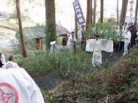 到着(PM7:30) 神門神社本殿へ到着、御小屋で神楽奉納。舞われる神楽は比木に伝わる高鍋神楽 2日目の行事「お衣替え・ドンタロ祭・夜神楽」 御神体お衣替えの神事(AM10:30) 神門比木神社の神職1人ずつ本殿に入りご神体の衣替え、和紙で出来た13枚の衣を替える。御神体を見た者は誰も居ないとか・・ ドンタロ祭(PM3:00) 追っ手との戦で百済王を助けた地元豪族「ドンタロ」さんの塚へお礼参りの神事。 弓の将軍神楽 山宮さま 家畜・農事の神事神楽、お互いの笹竹で舞いの邪魔をする珍しい神楽 田植神楽 洗濯行事(PM4:00) 小丸川で王の衣を洗濯をした故事にならう神事、その後川原の石を左肩に担いで石塚まで運ぶ。川原の土手にに火をつけ野焼き、石塚の石は増えないと伝わる。 夜神楽(PM7:00から12:00) 優雅な高鍋神楽33番中18番が舞われる。神楽の中には華麗な舞からユーモラス・エロチックな舞と大変ユニークな舞がある。 3日目の行事「下りまし」 お別れ式(AM10:30) 境内でお別れ食事 目黒塗り(AM10:00) 別れの悲しみを笑って隠す「へぐろ塗り」。 祭典(11:30)下りまし 一本鳥居で比木神社を先頭に、婦人達は炊事道具を手に手に「オサラバー」・・・ 両社お別れ(12:00) ご神体に笠を着け出発、米上で洗顔へグロを落とす。 見所が沢山あり、2泊3日で参加されると満足できます。 作成にあたり百済の郷南郷温泉観光協会のパンフレット・西の正倉院掲示文章など参考にさせていただきました。 周辺の観光地:おせりの滝 牧水公園 若山牧水生家 馬ヶ背 周辺の温泉:温泉県北で探す 周辺の宿泊施設:日向市で探す 戻 る TOPへ |