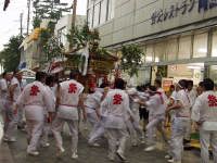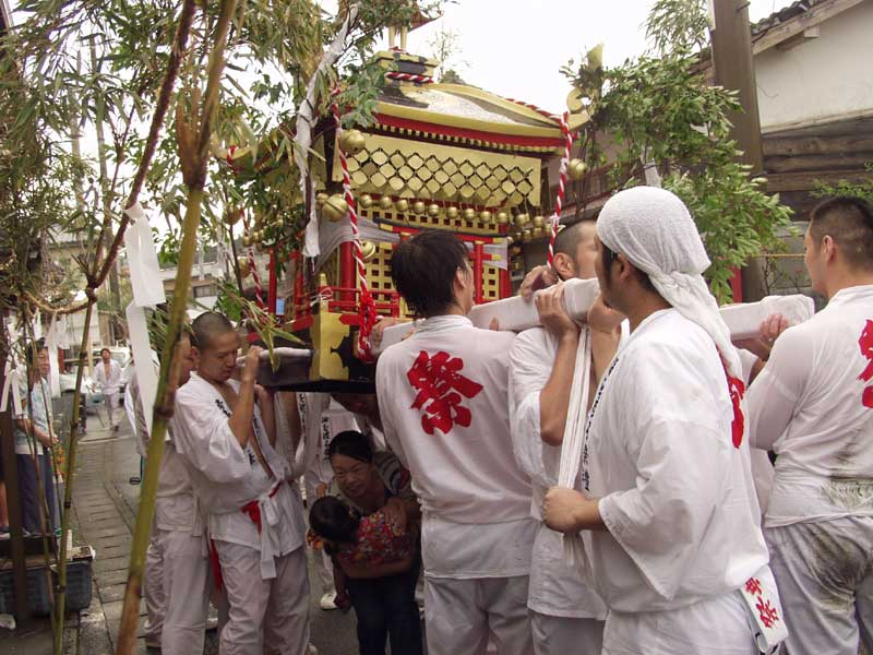 海を渡る祭礼/青島神社昭和23年から御祭神を海積宮にお連れして御霊をお慰めする海上渡御が氏子漁民の発意により行われる(海を渡る)ようになり、またこの時期に浜下り歌も作られたそうです。 海を渡る祭礼は、氏子の中で22・23才になった若者が主催し、青島神宮が後援するという形で執り行われます。海を渡るお祭りは県内では青島神社の海を渡る祭礼だけです。 祭りは青島神社で出御の祭事が執り行われた後、22・23才成年男子に担がれて青島地区を2日間に渡って練り歩き、途中主要な箇所で「暴れ」とと言われる御輿を勢いよく2回・3回と回ながら巡幸します。各地区を回り「暴れ」の合間に小さな子供やお年寄りの人達は御輿をくぐって無病息災などの御利益を受けます。 「暴れ」は御輿が海を渡る際のうねりや大波を表現したもので、御輿は勢い余って倒れそうになったりたり、担ぐ若者が怪我をしたり、と激しく暴れます。