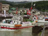 白浜海水浴場で2回3回と暴れが行われた後、海の中を若者に担がれて御座船へと移ります、御座船は青島漁港に所属する大漁旗を掲げた漁船十数隻に先導されて列を作って青島を1周します。 青島海水浴場へ到着すると、暴れを行った後再び若者に担がれて御座船へ乗り込み、青島を1周して青島漁港にある天満宮(天神様)へお入りになります。 2日目は、天神様をお出になり残りの各地域を巡幸11箇所でご休憩・暴れを行い、青島神社へ還御になります。 青島神社の詳しい情報はこちらをご覧下さい。(別ウインドで表示します) ご巡幸の途中、「浜下りの歌」が歌い手数人により歌われ、それぞれの場所毎に違った内容の歌詞を、牧歌的に歌い上げ、まつりを盛り上げています。 宮出しの歌 さあさあ出まし青島様の御幸ささえん氏子達 今日は吉日うぶすな様の里は賑わいむつじあい 本歌 ここは青島波紫の中に浮島八重畳 畳重なるあの大岩根神の宮居の礎よ 神の宮居を守れるビローその葉広々末さかゆ ・・・・・・ 補助歌 戸崎並びの青島様は地から生えたか浮島か 港口には黄金の真砂沖の小戸の瀬宝浮く 今年しゃ良い年穂に穂が付いて道の子草も米がなる 五十鈴川下青海の原よ中に青島龍神宮 今年しゃ良い年かつおが大漁浦のさざ波かね寄せる さてものどかや地福の浜で鶴と亀とが舞遊ぶ 廻り廻りて白浜様よ御崎観音守り神 さあさあたのむよ若い衆方よ今日は吉日夏祭り 御休み所 御道すがらの御休みどころ休みましませ許しませ 御支え人や御共達しばしの憩い給えとぞ 還御 槍は袋に刀は鞘におさむるましますめでたさよ 御幸ご無事に御支え終えてお着きまします目出度さよ 氏子うれしや千代よろずよにいかしやくわえ栄ゆらん 千終万歳思うこと叶た末は鶴亀五葉の松 お問い合わせ 青島神社 0985-65-1262 戻 る 祭りTOPへ |