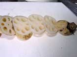 @ れんこんは、1cmの斜め切りにし皮をむき、茹でる。 | ![]() |