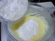 B卵2回に分けて加え、泡立て器でよく混ぜる。(途中で分離しそうになったら分量の粉を少し加えて混ぜる)ふるった粉を混ぜる。