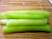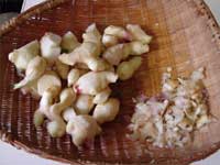 いんげんはすじをとり、半分におる。 こんにゃくは水から入れてゆで、 縦半分にして包丁をねかしてさざなみ切りにする。 じゃがいもは皮をむいて5oの斜め切りにしてさっと水につける。 にんじんも5mmの斜め切りにする。 牛肉は3cmに切る。 赤唐辛子は種を取り、小口切りにする。 |