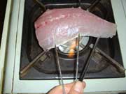 A金串を刺し、強火で皮に少し焼き色がつくまで焼く。