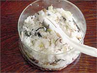 山菜おこわは、天然のわらびやたけのこを使いましたが、宮崎ではもうないと思いますので、スーパー等に売っている味つけ山菜パックを使ったのと2種類にしました。電子レンジで簡単に出来るので、作って下さい。 |
