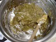 混ぜながら練り、好みの固さに仕上げる。(あまり強い火ですとこげるので注意)